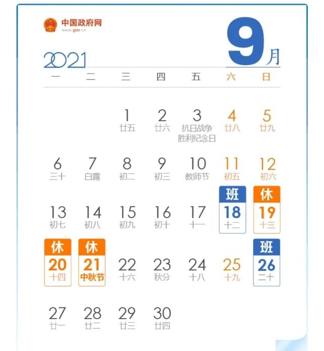 中秋节假期, 2021年中秋节放假安排时间表来了 万年历