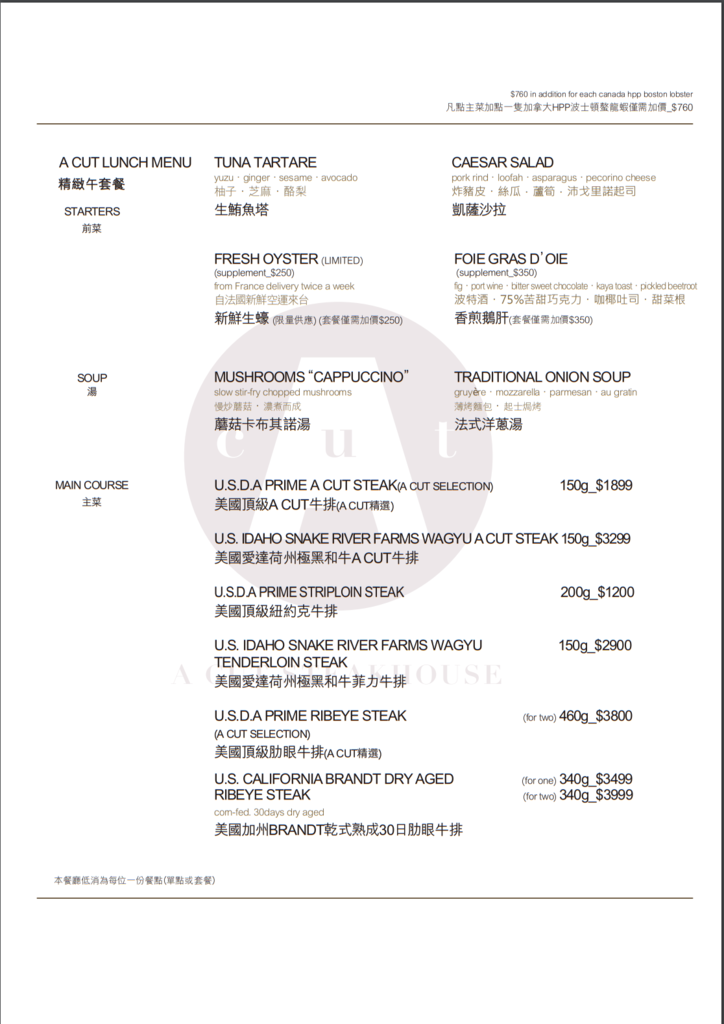 國賓a cut 價格. 錯過這次振興方案別灰心最近在 粉絲頁 又看到 國賓推出 A Cut 星級榮耀 住宿方案 午餐專案 NT 8800 起 晚餐專案 NT 11800 起雖然總價看起來比較高一些些但專案附贈的牛肉是 澳洲和牛肋眼. 不過國賓的A cut沒有任何調味 還是需要加點鹽巴帶出他的甜味 單吃的時候會覺得口感是嫩的 但少了些許肉的甜味 搭配鹽巴之後就會好很多 這一份150g的單點價位跟肋眼差不多 是2700 套餐價格則是3900 但須注意這是一人份的套餐價格. 餐廳名稱A CUT牛排館 消費時間20188 地址台北市中山區中山北路二段63號 電話02 2571 0389 營業時間11301500 18002230 每人平均價位2700 可否刷卡可 有無包廂有 推薦菜色牛排 部落格好讀版 httpslanlantwacut 以下純文字複製貼上 每每看到大家討論 台北高級牛排 國賓飯店的A CUT牛排.